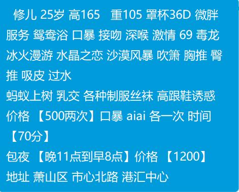 [xinxitop]提示信息[/xinxitop] 【寻欢时间】:没去过 【寻欢地点】:杭州萧山(大概位置) 【信息来源】:QQ群 【服务项目】:鸳鸯浴,漫游,胸推,69式,冰火,口活,爱爱、SM 【妹妹数量】:1个 【环境设备】:在港汇中心,公寓,环境应该还可以 【营业时间】:看着都是电脑在线,能回复就行把 【价格一览】:500/2P 【安全评估】:100分 【服务星级】:★★★★★(最高5星) 【重点推荐】:看照片跟服务表其实挺不错的 【联系方式】:[unfree]QQ:2803822339[/unfree] 【寻欢细节】:木有去过 【附带照片】: