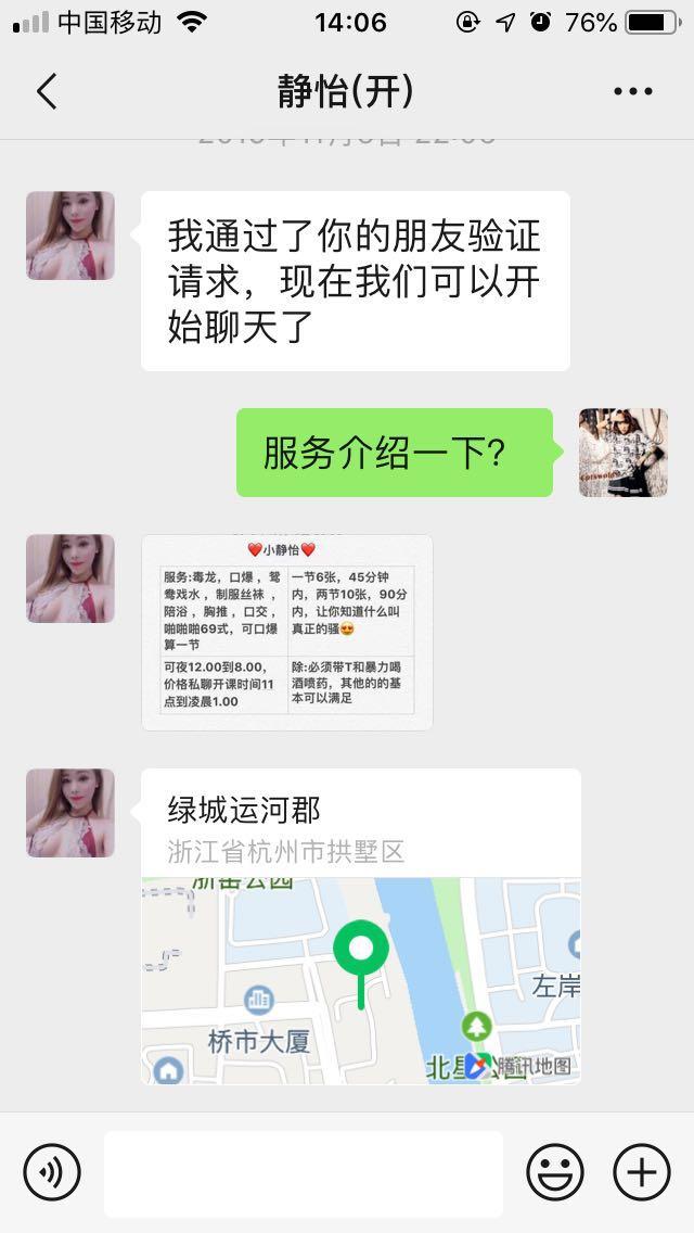 [xinxitop]提示信息[/xinxitop] 【寻欢时间】:2020年3月10日 【寻欢地点】:杭州拱墅区 【信息来源】:狼友推荐、论坛、亲身体验 【服务项目】:鸳鸯浴,漫游,胸推,69式,冰火,口活,爱爱、(可选,勿必填写真实服务项目) 【妹妹数量】:1 【环境设备】:还行 【营业时间】:11:00~凌晨1:00 【价格一览】:600/P 1000//PP 【安全评估】:评分,满分90。 【服务星级】:★★★★ 【重点推荐】:非常淫荡非常骚! 【联系方式】:[unfree]微信:iii19967[/unfree] 【寻欢细节】:一个非常非常骚的妖艳少妇,身材很不错,2个奶子很大,口活也很爽。叫声非常淫荡非常骚!估计是楼凤第一骚!喜欢骚的朋友,可以去试试! 【附带照片】: