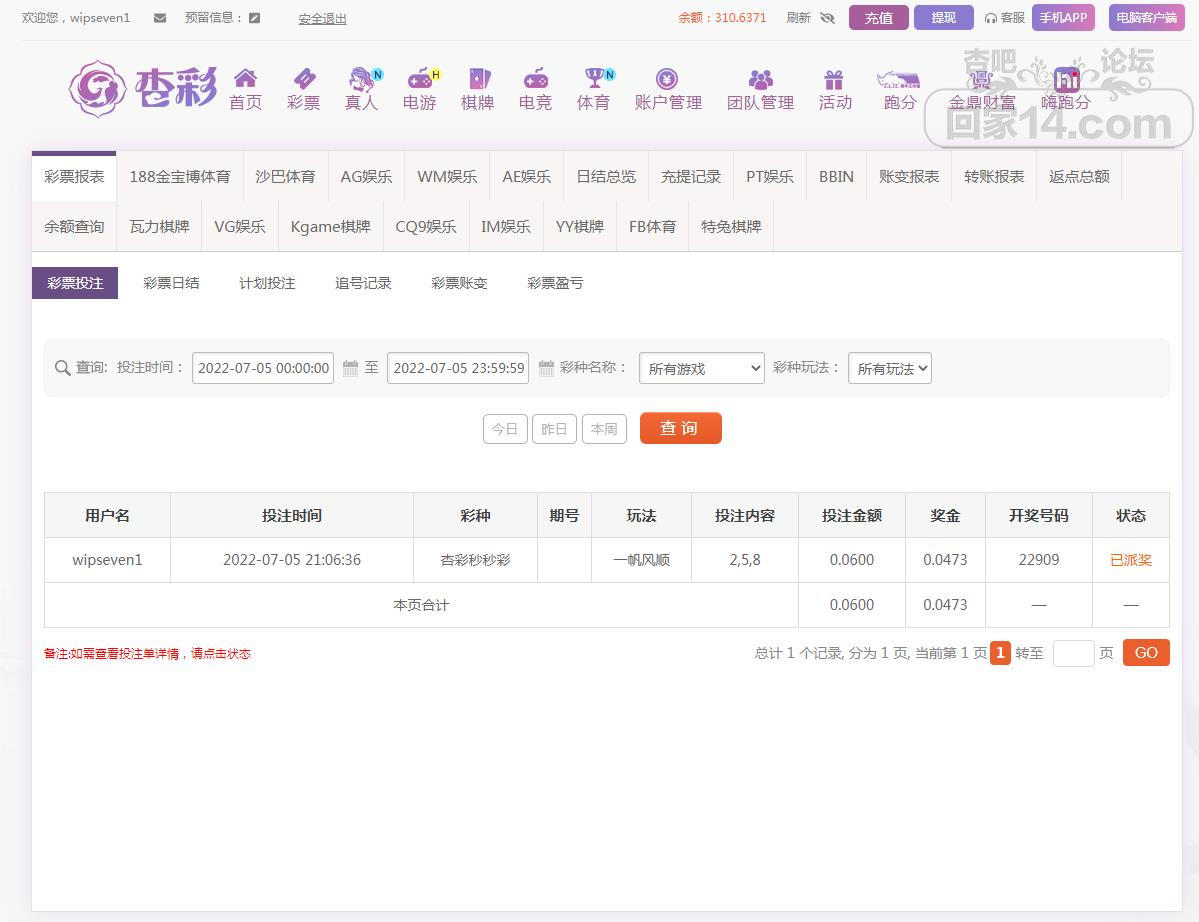 杏彩下注快频彩赢单
