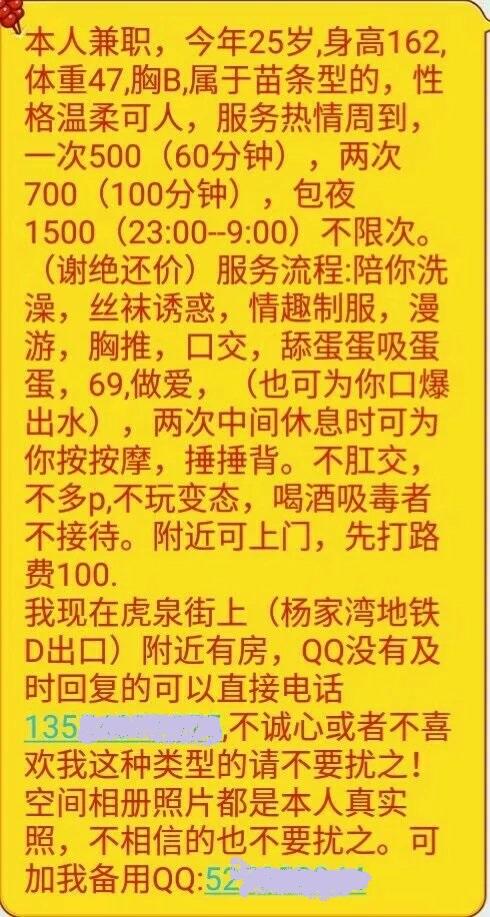 【寻欢分享】:直接打车到地,打电话让XJ来接,(电话联系的时候一定要告知网名哦)比照片上差一点,不过还是很好的,可以接受。小姐住的环境也不错的、方便、也安全。进门后,陪浴,接着冰火,KJ,用那小舌头在你的乳头边划圈圈,KJ时次次深喉,那叫一个爽啊,小JJ不自觉的翘起来了。带TAO进穴,那XJ意见水漫金山了,水好多,像涂了润滑剂一样,小B还是蛮紧的,女上男上法100回合后换背入式,由于中午酒喝了不少,最后在老汉推车下交货,然后XJ退TAO有那诱人的小嘴帮你清理干净。 【附带照片】: